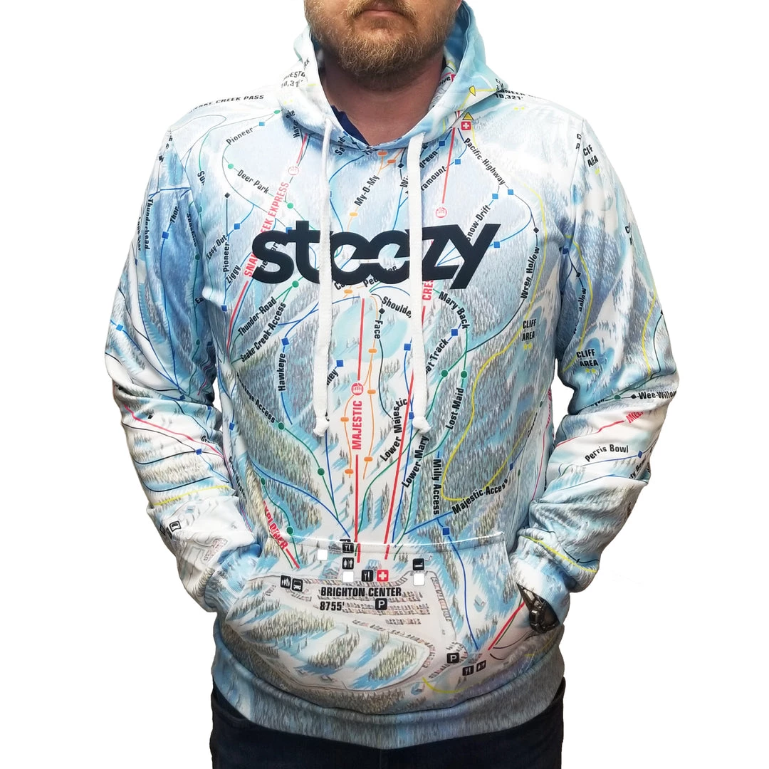 A Steezyย collaboration with Brighton Ski Resort in Utah features officially licensed ski resortย trail mapsย onย adultย hoodies.