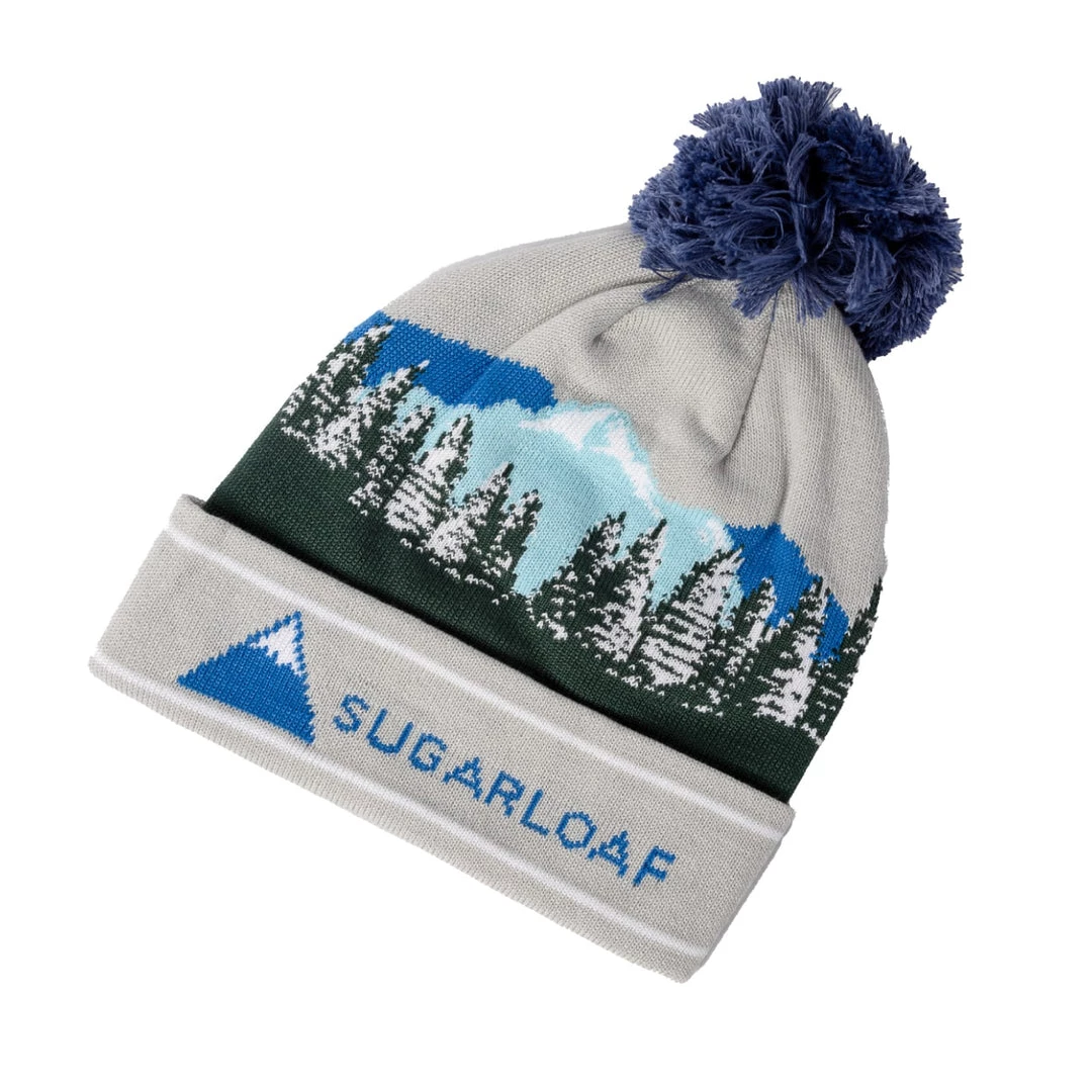 Adult unisex beanie from Locale with Sugarloaf logo and top pom. One size fits all.
