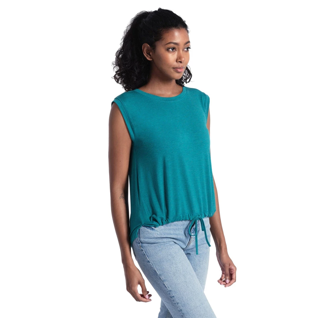 Wide and dropped shoulders giving the illusion of a cap sleeve, itโs a modern take on a classic workout tee. The front drawstring makes it totally adjustable and customizable to your body. Its relaxed fit and ultra soft lush heather fabric will make you instantly grab it out of your closet and have you wanting to wear it day in and day out.